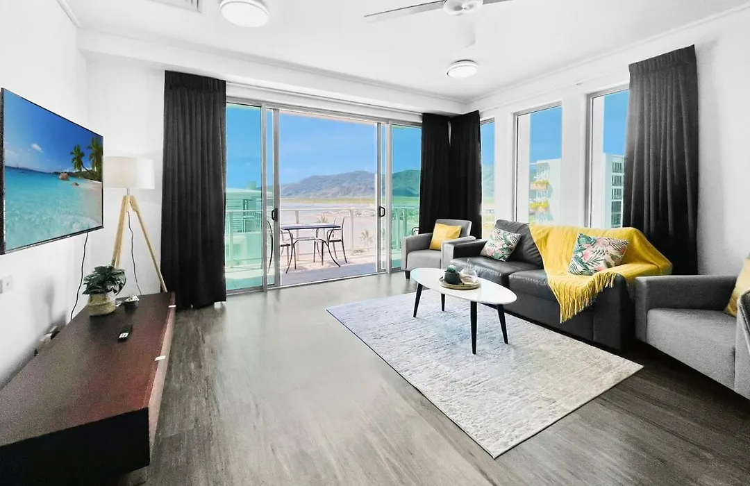 The spacious '12' Top Floor Luxe Apartment - 2Br 2Ba Ocean Views Pool Gym Cairns is located just a 5-minute walk from the public Cairns Aquarium and 3.6 km from the flecker Cairns Botanic Gardens. Guests can use an ocean-view gym and a rooftop swimming pool while staying near the Michaelmas Cay.